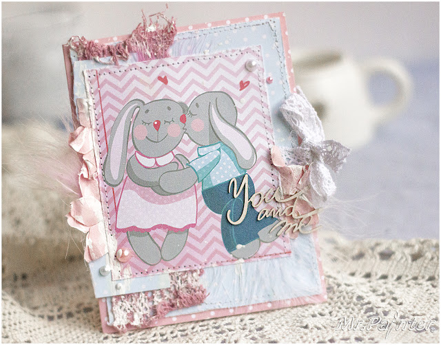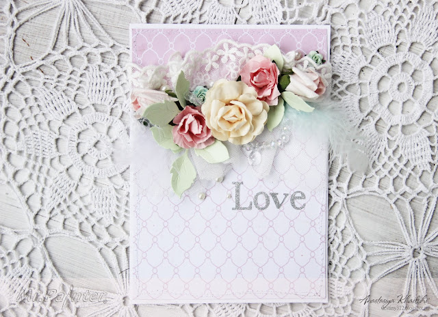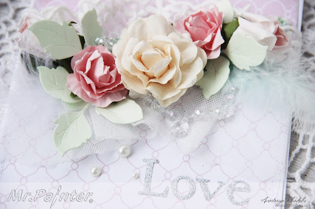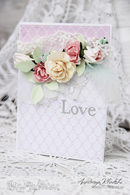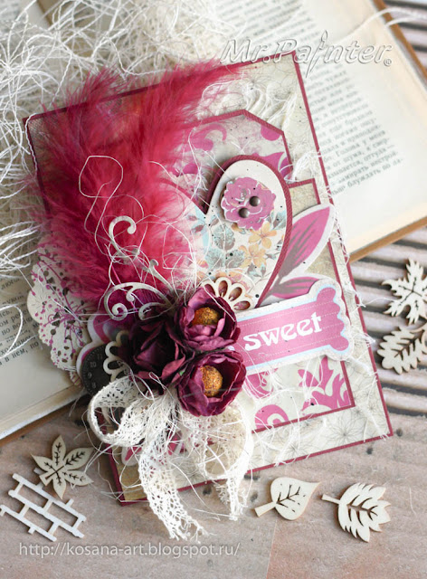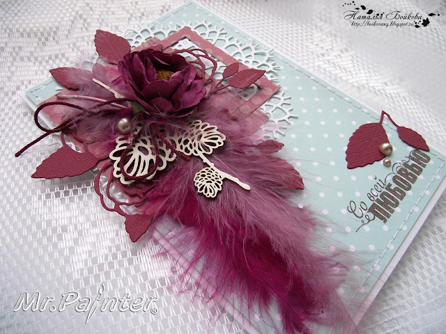 У меня открытка из бумаги из коллекции "Мамина радость", цветы "Mr.Painter", "Mr.Painter" PSW Бумага для скрапбукинга 30.5х30.5 точки, "Mr.Painter" PLU-03 "Перья декоративные"