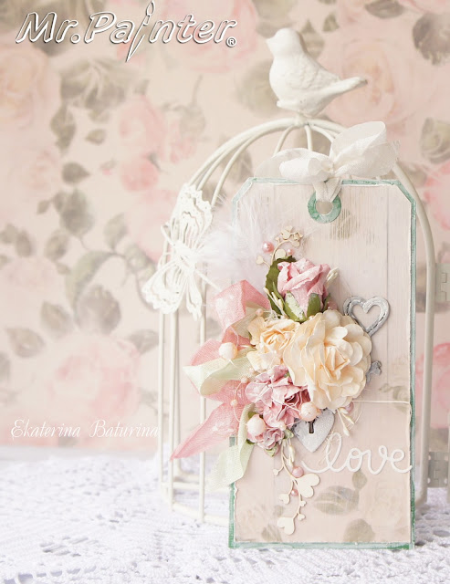 По заданию я сделала тег в нежных тонах. Белое перышко придало ему особую легкость.