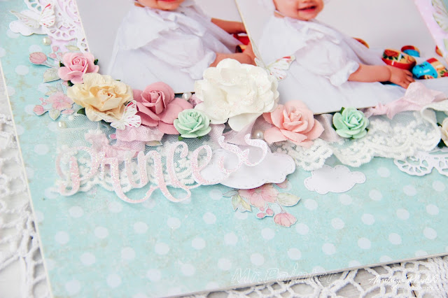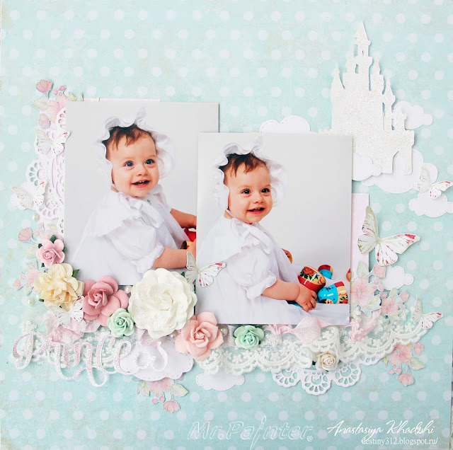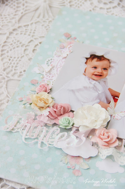 Для странички использовала бумагу из чудесной романтичной коллекции "Цветочный"набор "Брадс" из этой же коллекции, а также цветы "Mr.Painter". Розочки на фоне - потрясающий штамп "Розовый куст".