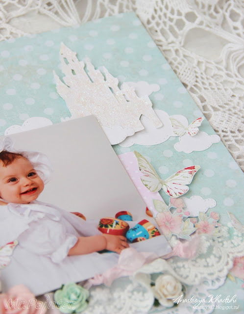 Замок я вырезала с помощью плотера и покрыла его глитером. А бабочки распечатала на принтере и вырезав добавила в работу.