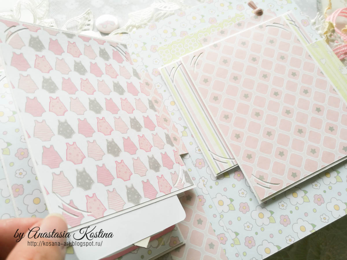 Кроме ниток для вязания и кружев в альбоме использовала декоративные элементы и карточки "Лапочка дочка", чипборд "Босоногое счастье", полубусины бледно-розовые, брадсы и анкеры